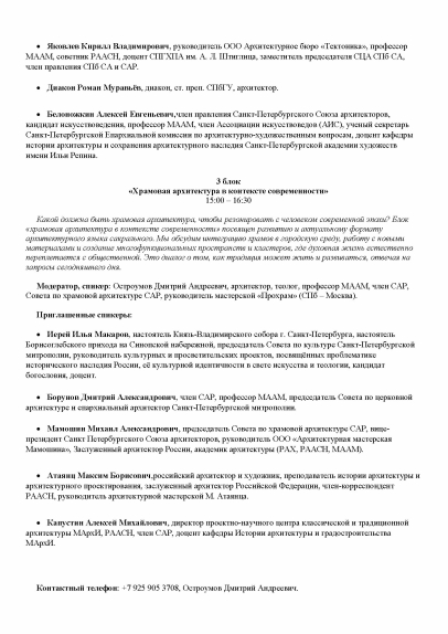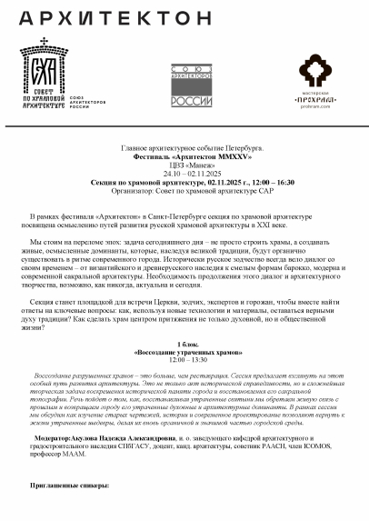 М.А. Мамошин примет участие в работе Секции по храмовой архитектуре в рамках фестиваля Фестиваль «Архитектон MMXXV» в ЦВЗ «Манеж» (Санкт-Петербург, Исаакиевская пл., 1). Подробная программа дискуссий прилагается (см. изображения)