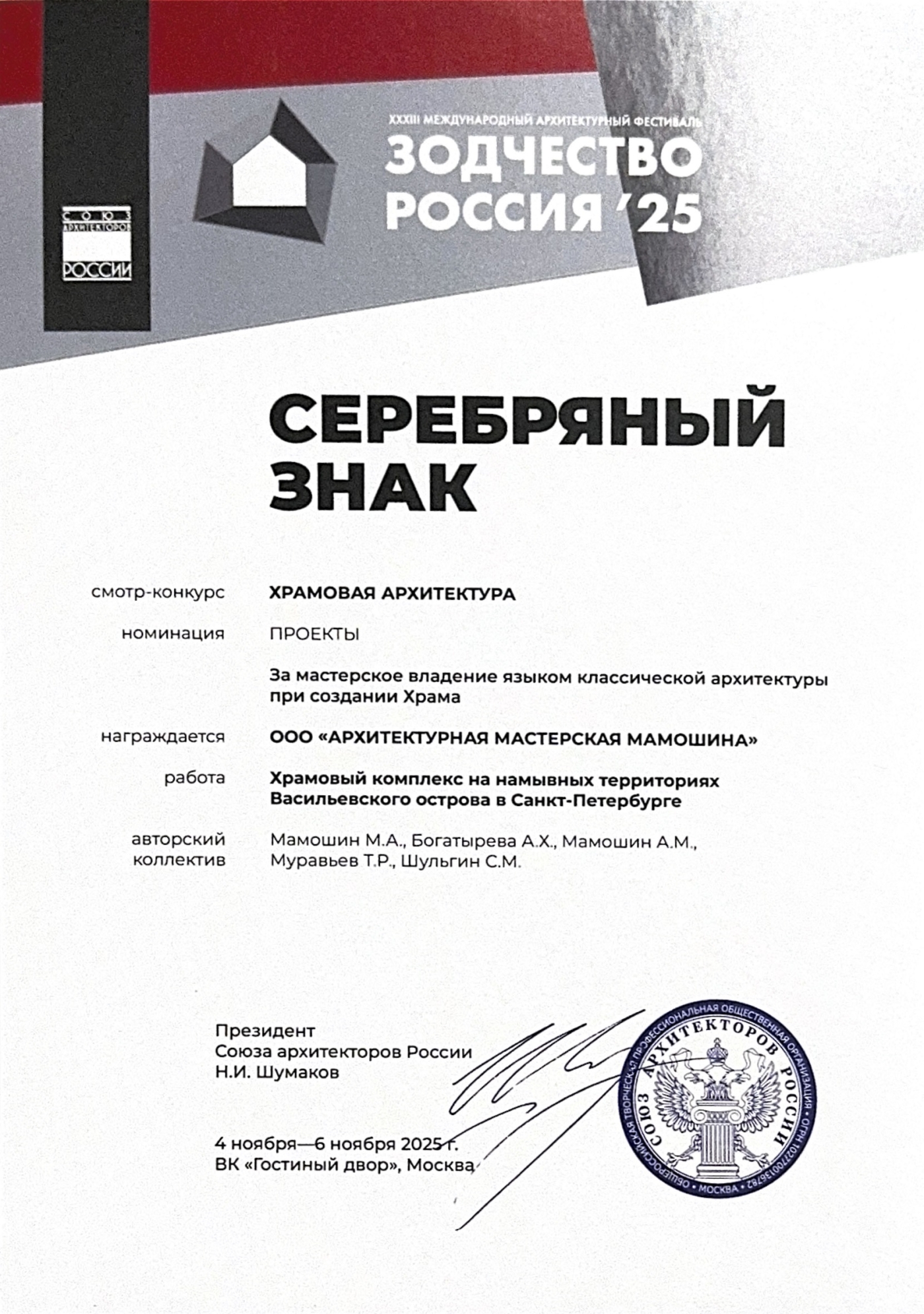 Серебряный знак фестиваля «Зодчество» за мастерское владение языком классической архитектуры при создании Храма получила наша работа «Храмовый комплекс на намывных территориях Васильевского острова в Санкт-Петербурге».
