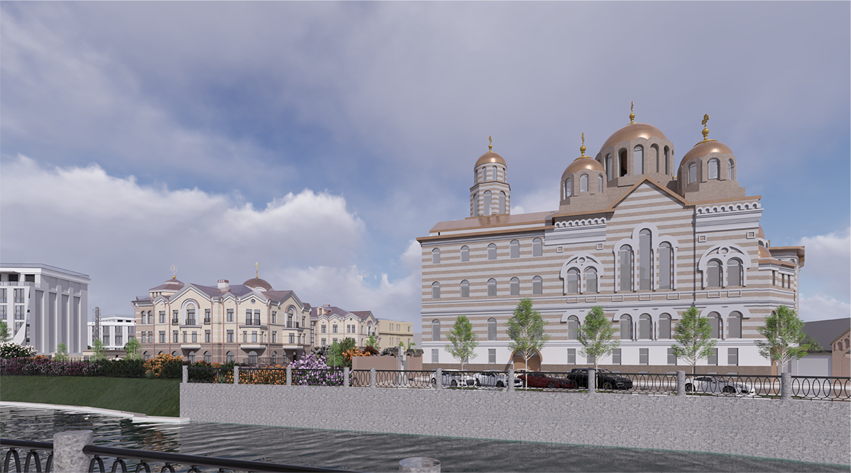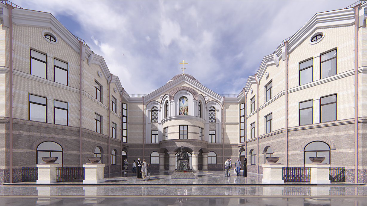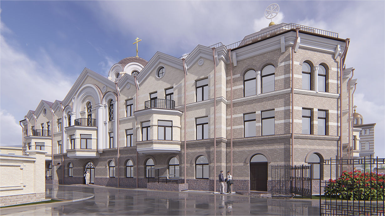 Архитектурно-художественное решение здания со- знательно обращается к византийскому стилю, что создает смысловую и визуальную преемственность с главным храмом монастыря. Этот диалог проявляется в лаконичных объемах, ритме арочных проемов и использовании характерной для византийской традиции пластики фасадов. Композиция продольных фасадов симметрична, увенчана низким византийским куполом на барабане. Поле стены оформлено рустовкой, нижний этаж на гранитном цоколе выделен темным кирпичом. Центральная часть объема вы- делена светлым кирпичом, ломаной линией метрического ряда фронтонов, а также тремя одноэтажными эркерами.