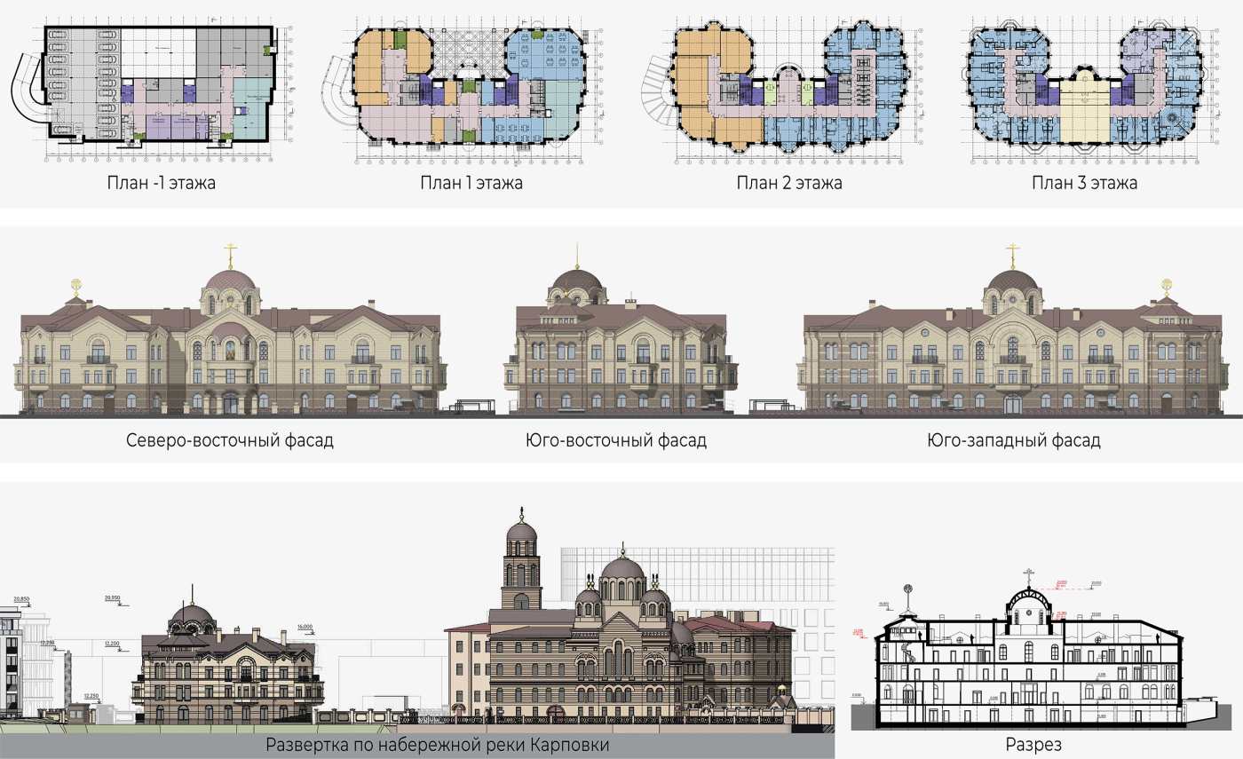 Объект в плане имеет п-образную форму. В его составе запроектированы воскресная школа, гостевой дом для паломников и домовая церковь, которая размещена на третьем этаже в центральной части и становится смысловой доминантой. Подземный уровень отведен под паркинг, технические и вспомогательные помещения. Функциональное зонирование реализовано по смешанному принципу: линейный корпус воскресной школы обращен к улице Профессора Попова, а гостевой флигель – к набережной Карповки, что обеспечивает оптимальную организацию внутреннего пространства и удобные связи между блоками.